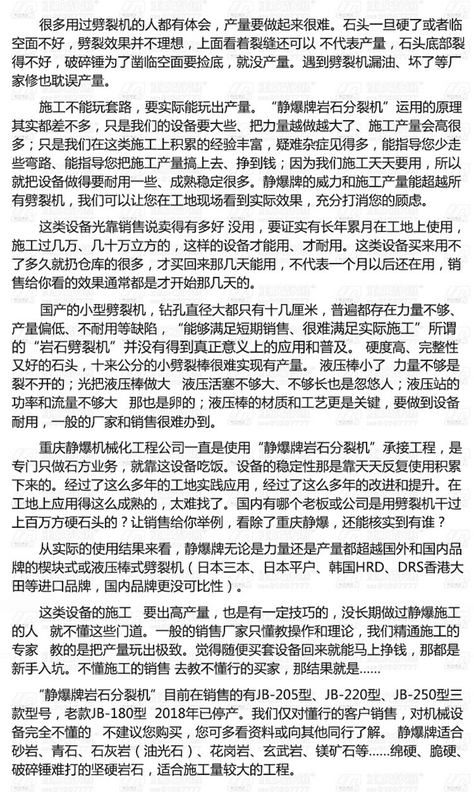 可以和市面上任何”劈裂機(jī)”“劈裂棒” 比力量、比效果、比產(chǎn)量… 如有需要請(qǐng)聯(lián)系:靜爆重慶研究院 電話:023-81687777